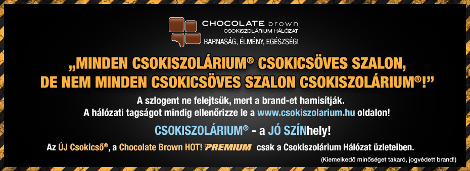 Cu multă bucurie vă anunţăm că visul nostru din 2011 a devenit realitate în 2013! Am creat o reţea naţională – chiar internaţională – de saloane de bronzat care face posibilă furnizarea de servicii la un nivel de calitate unitar, ceea ce nu a existat pănă acum în Ungaria. Solar de Ciocolată® este o marcă înregistrată care vă va aminti de servicii ireproşabile ce respectă aceleaşi standarde înalte. Deţinătorul Legal al reţelei este Sun System Kft., una dintre cele mai importante firme din industria saloanelor de bronzat din Europa Centrală şi de Est, astfel este garantat acestor studiouri sprijinul profesional ireproşabil. Deţinătorul Legal verifică riguros activitatea anterioară a firmelor interesate să se înscrie în reţea, precum şi calitatea serviciilor oferite de acestea, în acest fel se pot alătura Reţelei Solariilor de Ciocolată doar unităţi ce garantează clienţilor săi servicii de o calitate superioară.